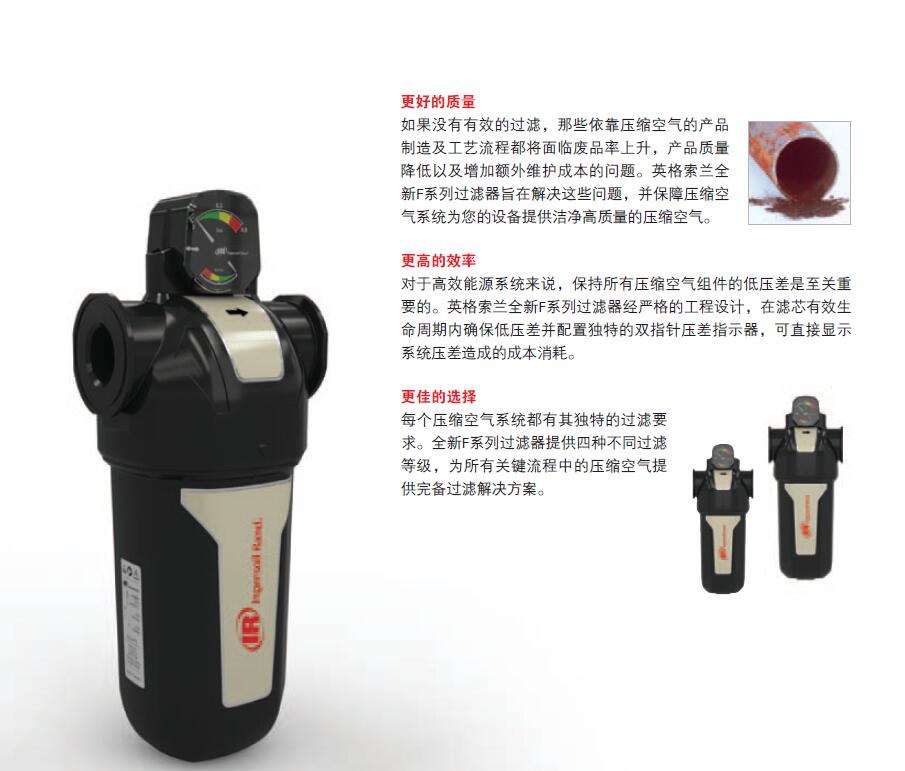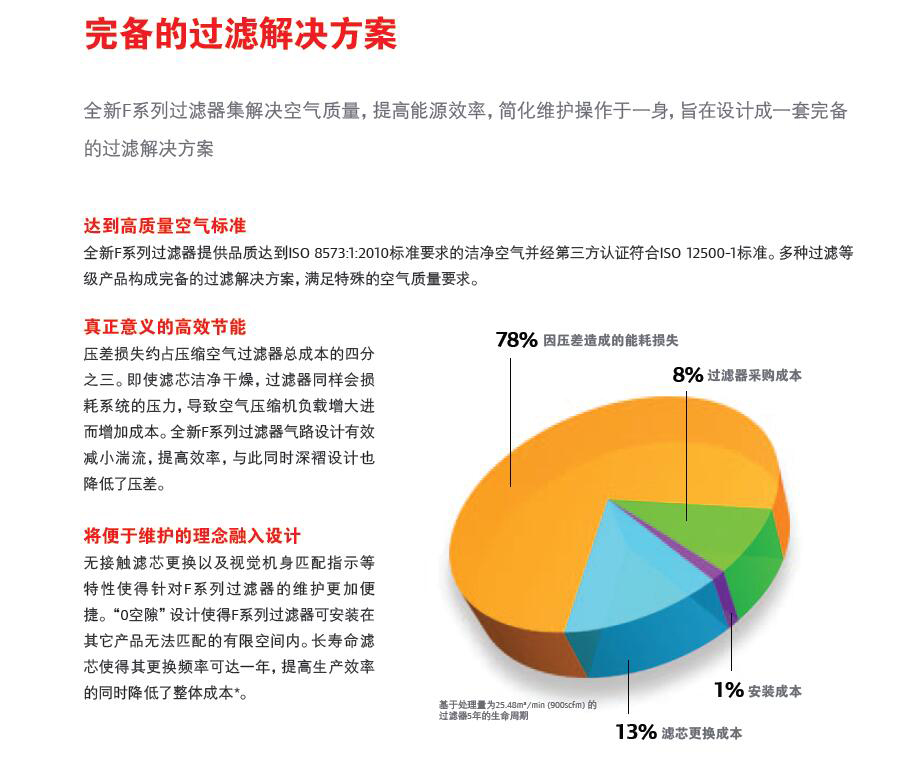 全新F系列過濾器提供品質達到ISO8573空壓機品牌:1-2010標準要求的潔凈空氣并經第三方認證符合I5O12500-1標準。多種過濾等級產品構成完備的過濾解決方案,滿足特殊的空氣質量要求。